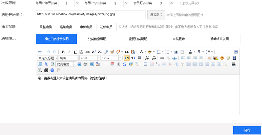 大转盘为商家提供转盘抽奖服务,商家只需设置活动时间、活动规则、活动奖品等信息就能发起活动,粉丝进入活动界面,点击开始抽奖,即有几率获得不同类型的奖品。